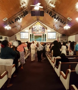 En met reden: de dienst kan zich meten met de beste shows die ik op dit gebied in New Orleans heb beleefd. Nadat ik, als verstokte zondaar, op een van de achterste van de zestien rijen heb plaatsgenomen kan ik nog net de laatste minuten van de zondagsschool meepikken en zonder enige overgang beginnen drie soulvolle vocalistes aan de inleidende gezangen. Dit belooft veel goeds en inderdaad, daar zoekt het 23-koppige ADT Rapture Ready Choir zijn plekken achter het altaar reeds op.