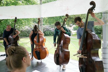 Langs een lang, rood koord ging de wandeling naar een uitvoering door leerlingen van de kunstacademie Noord-Limburg onder leiding van Koen Evens bij twee sculpturen van de kunstenaars Dimph Van Aarken en Harm Meindersma. Hier tekenden Dennis Boonen met elektrische gitaar en Louis Paumen met percussie voor wederkerende motieven, terwijl Tieke Van Winkel met elektronica geluiden opving en die sterk vervormd doorheen de opstelling stuurde. Hier bewonderden we vooral de durf van de jonge muzikanten, want wat eerst intrigeerde werd toch wat langdradig.