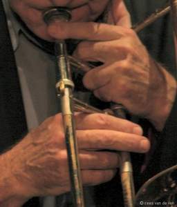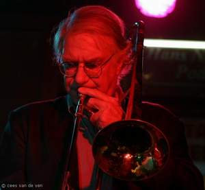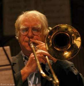 "Ook Mingus behoort tot mijn favorieten. Zijn composities vind ik van een waanzinnige genialiteit getuigen. Ik ga daarom altijd naar de Mingus Dynasty Band als die weer in de buurt is. Bill Holman, die uit de stal van Kenton komt, vind ik ook een heel bijzonder componist en arrangeur. Hij is een exponent van de Amerikaanse studioscene uit de jaren vijftig en zestig. Later heeft hij een eigen big band geleid en daarmee vijf briljante cd's opgenomen. Hij komt nog regelmatig naar Europa om voor de diverse radio-orkesten te dirigeren, arrangeren en zijn composities uit te voeren. Hij is ook verschillende keren in Hilversum geweest. Ik heb hem hier regelmatig ontmoet en mijn Contraband-cd's laten horen. Hij was daar erg complimenteus over. Dat streelde me natuurlijk enorm. Ik zag enorm tegen hem op." "Ik vind trouwens alle jazz wel leuk. Ik luister graag naar Louis Armstrong, maar ook naar Red Nichols of Bix Beiderbecke. Laatst heb ik een cd gescoord van het octet van altist Lennie Niehaus. West Coast jazz in optima forma, maar werkelijk fantastisch. Je weet niet wat je hoort. Die arrangementen zitten verbluffend in elkaar. Het lijkt bijna gecomponeerd door een klassiek componist. Het is tamelijk academische muziek. Naast Mingus luister ik erg graag naar Sonny Rollins. Die volg ik al erg lang. Ik denk echter dat ik niet meer naar zijn concerten ga. Ik heb het idee dat hij het nu zo langzamerhand gehad heeft. Drie à vier jaar geleden ben ik nog bij zijn optreden geweest in het Concertgebouw. Dat was enigszins teleurstellend. Vooral na de pauze zakte het in. Ik vond dat gênant en ben toen weggegaan. Hij heeft inmiddels een leeftijd bereikt waarop de prestaties kennelijk aanzienlijk minder worden, naar mijn idee." "Er is bijna geen jazzmuziek waar ik niet van hou. Ik begrijp het allemaal. Ik weet waar het vandaan komt en hoe het ontstond. Er zijn meer mensen waar ik een bijzondere voorkeur voor heb: Archie Shepp (de vroegere Shepp welteverstaan), Roswell Rudd en mijn absolute favoriete trombonist Jimmy Knepper. Eveneens ben ik een fan van Frank Rosolino. Ik heb hem nog live zien spelen in de botenloods van Van Dijk in Loosdrecht, ik dacht in 1975. Ik meen dat hij zich in 1978 voor zijn kop heeft geschoten, na eerst op zijn twee zonen te hebben geschoten. Buitengewoon tragisch. Hij was een leuke entertainer en zong ook, maakte grappen en grollen en speelde voortreffelijk trombone. Hij had dus kennelijk, zoals meer grappenmakers, een sombere of duistere kant." "Ik vraag me wel eens af waarom mijn voorkeur uitgaat naar merendeels blanke trombonisten. Ik heb het idee dat je een goede scholing moet hebben als je goed trombone wilt spelen. Het is namelijk een zeer moeilijk en lastig te bespelen instrument. Ik denk – zeker in het verleden – dat zwarten zich zo'n opleiding niet konden permitteren. Daardoor hebben de blanke trombonisten een voorsprong. Hoewel... Jay Jay Johnson en Jimmy Cleveland zijn toch uitermate goede trombonisten. Maar op de één of andere manier vind ik ze toch minder interessant dan Jimmy Knepper, Carl Fontana of Frank Rosolino. Naar mijn idee zijn de eerste trombonisten die geschoold waren en grondleggers waren van het jazztrombonespel Miff Mole en Bill Rank. Rank speelde bij Bix Beiderbecke en Mole bij Red Nichols. Zij hadden een grote techniek en harmonische kennis. Zij staan voor mij aan het begin van het goede trombone spelen. Dat zijn dus blanken. Volgens mij waren toen de zwarte trombonisten autodidact. De blanken daarentegen hadden een gedegen opleiding gevolgd, misschien zelfs wel op het conservatorium." "Als ik nu terugkijk op mijn muziekbestaan, kan ik alleen maar zeggen dat het zeer aangenaam en erg leuk is geweest. Uitzondering is natuurlijk dat vreselijke auto-ongeval waar ik het al eerder over had. Daar ben ik inderdaad echt een tijd van de kaart van geweest. Toen ik vijftien was had ik niet kunnen dromen dat het allemaal zo fantastisch zou gaan. Ik heb ontzettend veel van de wereld gezien, ik heb bijna geen slechte kritieken gehad, ik heb veel platen en cd's kunnen maken, ik heb in de leukste en beste groepen gespeeld en heb een paar geweldige grote orkesten kunnen leiden. En dat ik nu, nota bene op mijn vijfenzestigste, nog een leuke baan bij de radio heb, is toch ook helemaal fantastisch!" |