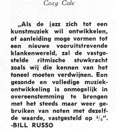 Ineens wordt de achtergrond van die hele Jazzdag/conservatoriumshowcase duidelijk. In (blanke) ogen diende jazz zich te ontwikkelen tot kunstmuziek en daar kan de door toch al suspecte zwarten ontwikkelde swing worden gemist als kiespijn. Want dat is iets wat niet aan te leren valt en daar zijn dit soort instituties niet van gediend. Negeren die swingers en verbannen naar de uithoeken van de muzikale periferie. Nu dat is aardig gelukt, ze zijn al gekomen tot kutmuziek. Nu nog de 'n' en de 's' zien toe te voegen en dan kunnen Ellington, Hampton, Monk en Russell bij het grof vuil. Alleen door het duidelijke gebrek aan echte inspiratie zit die uitbreiding tot kunstmuziek er - terecht - niet in. Op de plaat 'Warm Bad', uitgebracht in 1978, staat een nummer: 'Old Swingers Never Die'. De bekende toevoeging 'they just fade away' heb ik er niet achter gezet, maar zo voelde - in 1978 - en voel - in 2013 - ik het wel. Nog een reactie: 'Dag Herbert, Buma/Stemra is dus van plan de jazz gedag te zeggen in Rotterdam. Dat zal ongetwijfeld lukken gezien de programmalijst. Ik heb de uitverkorenen beluisterd via de door jouw meegezonden links. Nou wisten wij toch al dat de meeste instrumentbezitters (al of niet afbetaald) die een geluid kunnen produceren, veronderstellen dat het iets met jazz te maken heeft. Maar dat zo'n muziekbeschermingsorganisatie dit heeft samengesteld is toch zéér betreurenswaardig!! Het zou verboden moeten worden dit als jazz te promoten. Zo'n MOONTRANE bijvoorbeeld (vrij vertaald: MAANTRANEN). PHAEDRA + BAND: Mislukte uitvoering van de klompendans. TEUS NOBEL: Denkt Chet te zijn, maar staat als MILES met z'n rug naar het publiek. Hopend op meer inzicht in de jazzmaterie, Swingende groet van Frans' Ik ben weg. Maandje naar Vladiwostok om af te koelen.