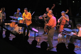 Op de derde dag van een 9-daagse Europese tournee, met concerten in België, Oosten-rijk en Slovenië, deed deze bijzondere groep het Bimhuis aan. De akoestiek aldaar zorgde voor een perfect geluidsdecor. Gratkowski en Robertson openden met sputterende, gorgelende geluiden op hun instrumenten, waarna de bassisten en drummers zich erbij voegden. De volvette tenorsax van Tobias Delius bracht het thema in... en weg was het achttal voor twee prikkelende sets vol interessante, vernieuwende muzikale vergezichten. Een concert waarin écht gecommuniceerd werd; niemand speelde ter meerdere eer en glorie van zichzelf. Als luisteraar werd je aandacht als het ware opgezogen door het muzikale discours op het podium, waar van alles gebeurde. Muzikaal meanderde het van intense, Ayleriaanse passages naar elegante miniatuurtjes en een onorthodoxe, tegen-draadse en spannende variatie op een shuffelende ballad. Kortom, een rijk klankenpalet in een boeiend schouwspel.